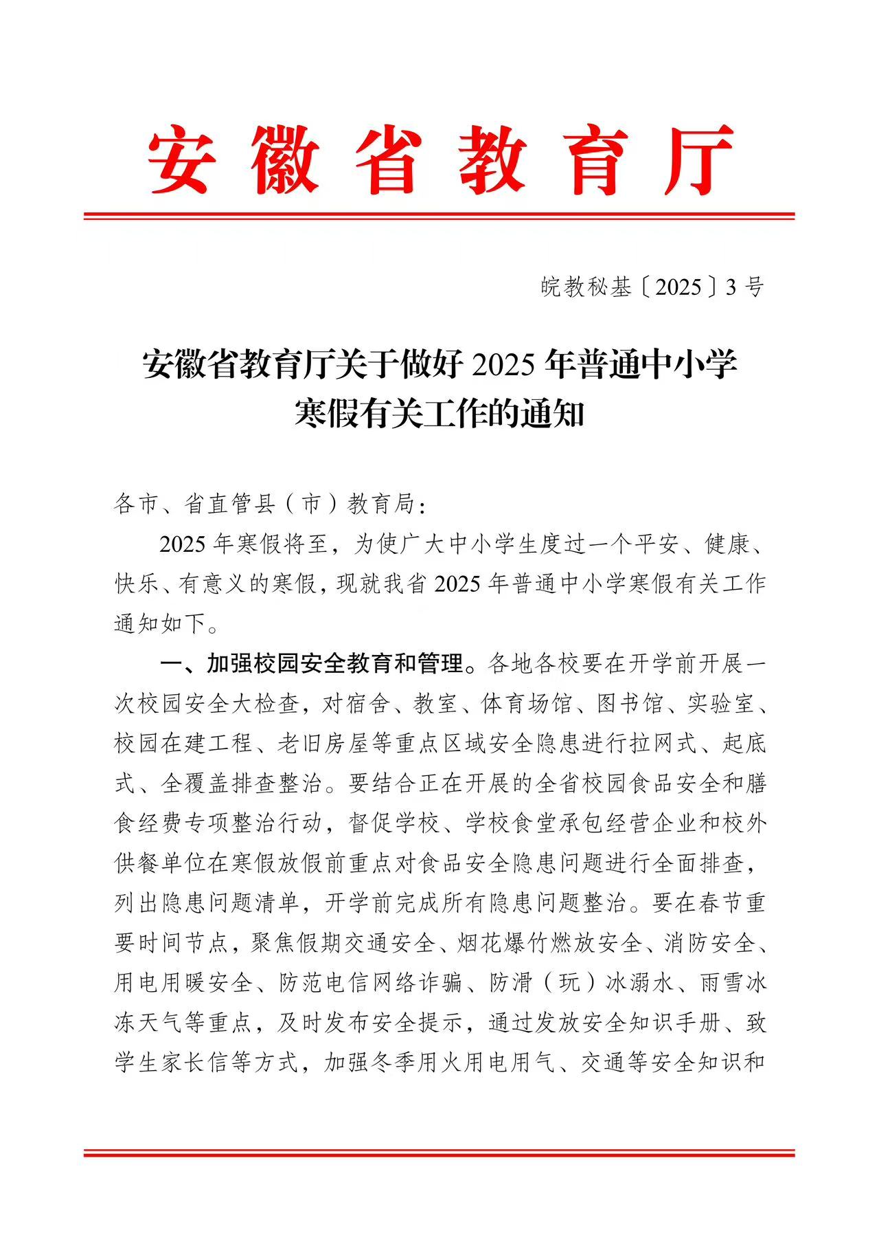 關(guān)于轉(zhuǎn)發(fā)《安徽省教育廳關(guān)于做好2025年普通中小學(xué)寒假有關(guān)工作的通知》的通知