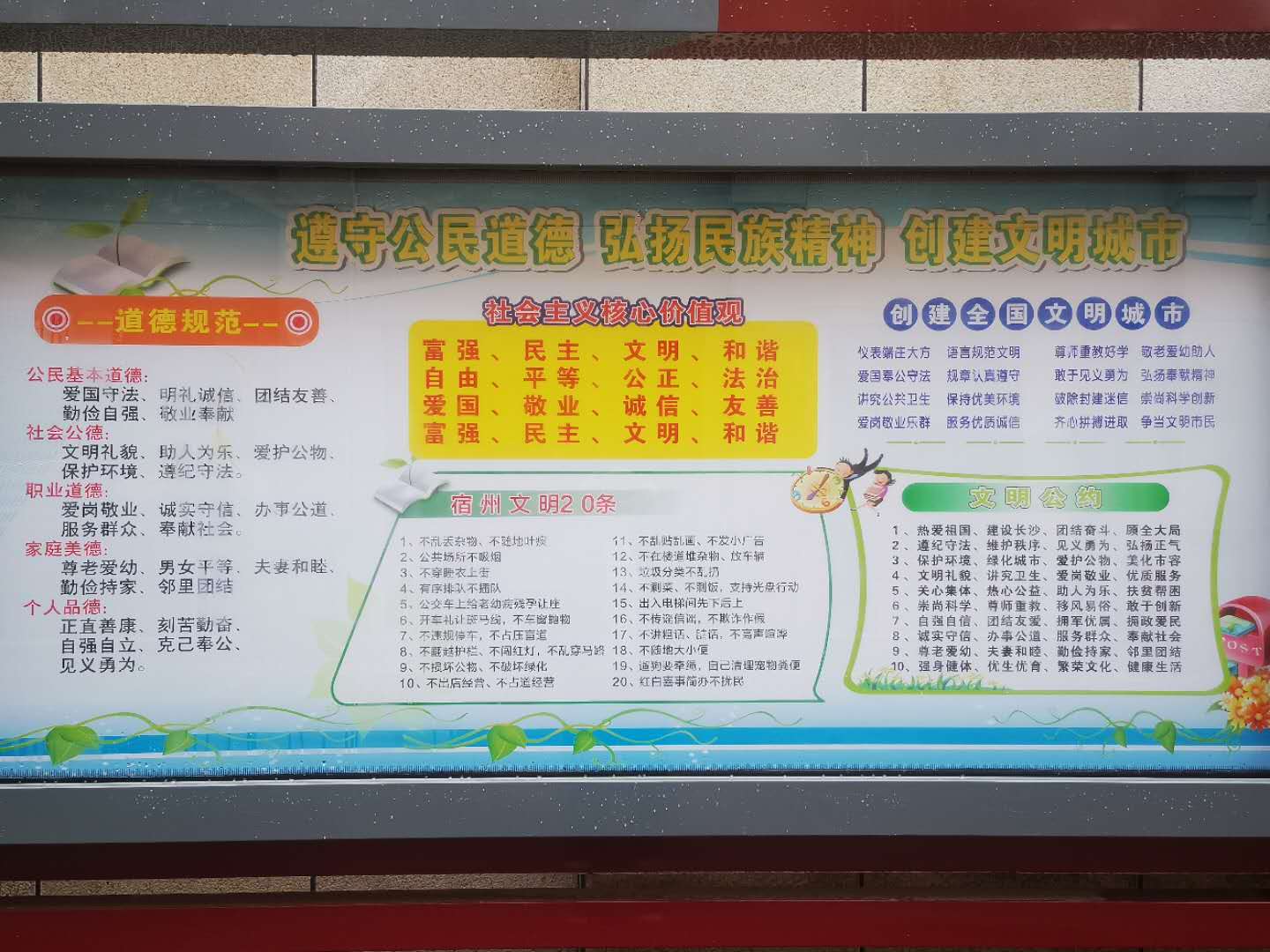 二、加大宣傳力度。我校開辟文明宣傳專欄,宣傳《宿州文明20條》等文明禮儀。同時在各辦公室醒目位置張貼“24”字核心價值觀。并利用電子廣告牌滾動展示文明創(chuàng)建內(nèi)容。
