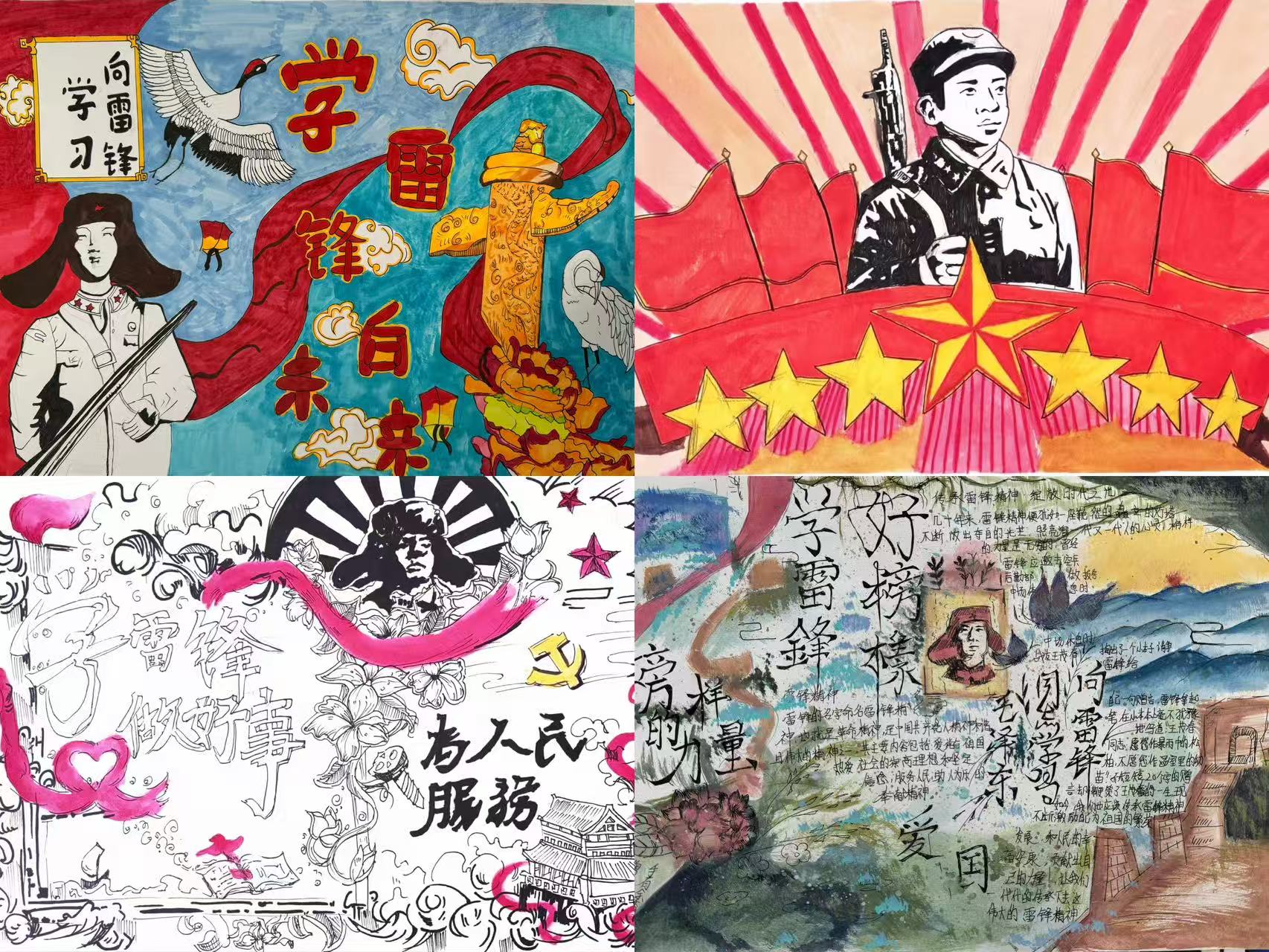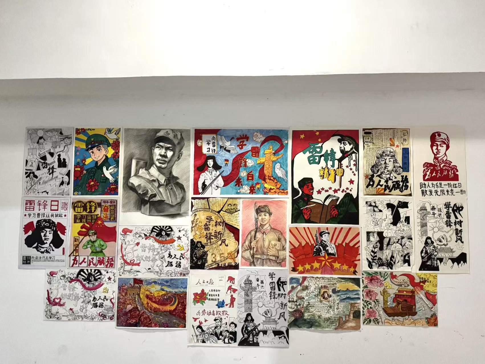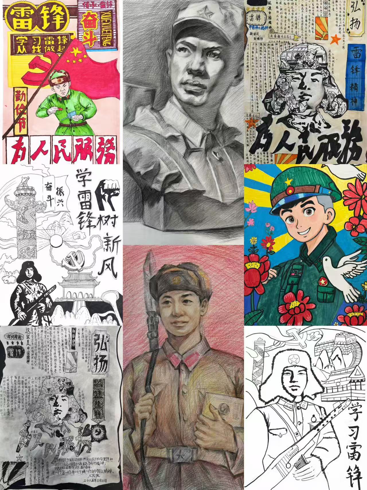 美術(shù)組發(fā)起的“鋒行畫卷”主題創(chuàng)作大賽,圍繞“雷鋒故事”“身邊微光”“公益行動”三大方向,激發(fā)學(xué)生創(chuàng)作熱情。200余件作品涵蓋素描、剪紙、彩繪等形式,以細(xì)膩筆觸展現(xiàn)雷鋒事跡、捕捉生活溫暖瞬間。這些作品在校園內(nèi)形成藝術(shù)長廊,師生駐足欣賞,讓大家在藝術(shù)的熏陶中深化對雷鋒精神的理解。