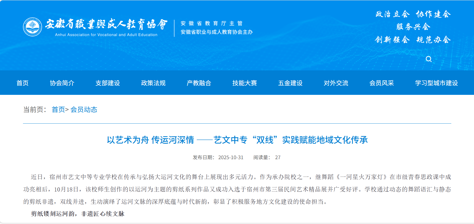 在由宿州市文學(xué)藝術(shù)界聯(lián)合會(huì)主辦、宿州市民間文藝家協(xié)會(huì)承辦的宿州市第三屆民間藝術(shù)精品展上,該校的“運(yùn)河系列”剪紙作品集體成功入選,成為展會(huì)一大亮點(diǎn)。